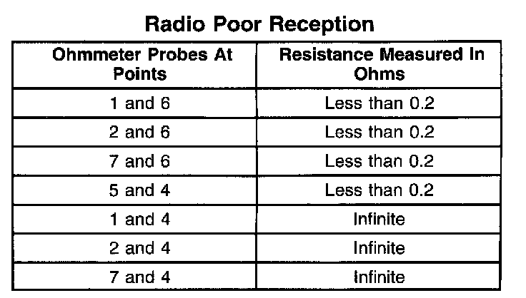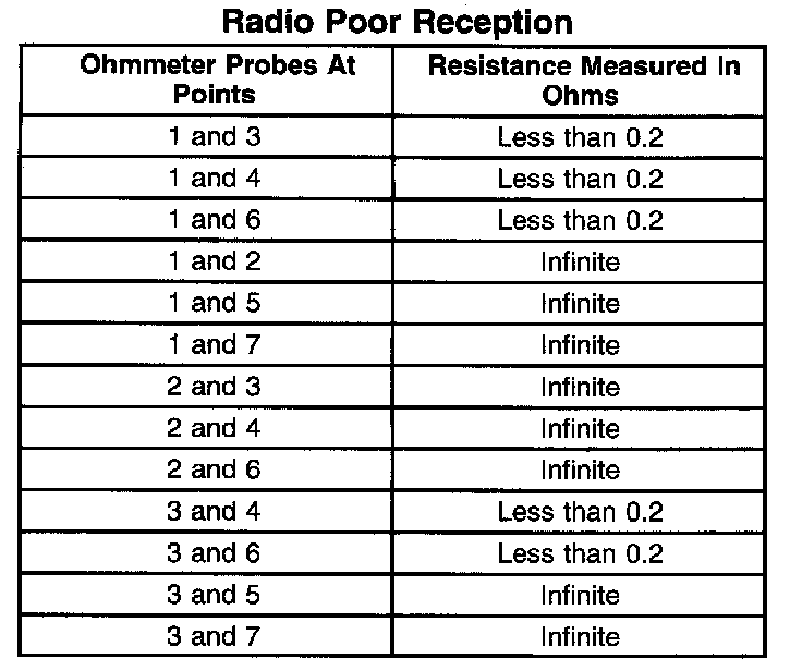 Inspect dipole wires within the windshield for breaks. Use the figure and table for the mast antenna as a guide to test for continuity within the antenna coaxial cable. Repair or replace any portion of the coaxial cable that does not meet the resistance measurements. If test antenna indicates radio is OK and lead-in checks fine, the windshield may need to be replaced. A defective windshield antenna results in loss of sensitivity, particularly on AM.