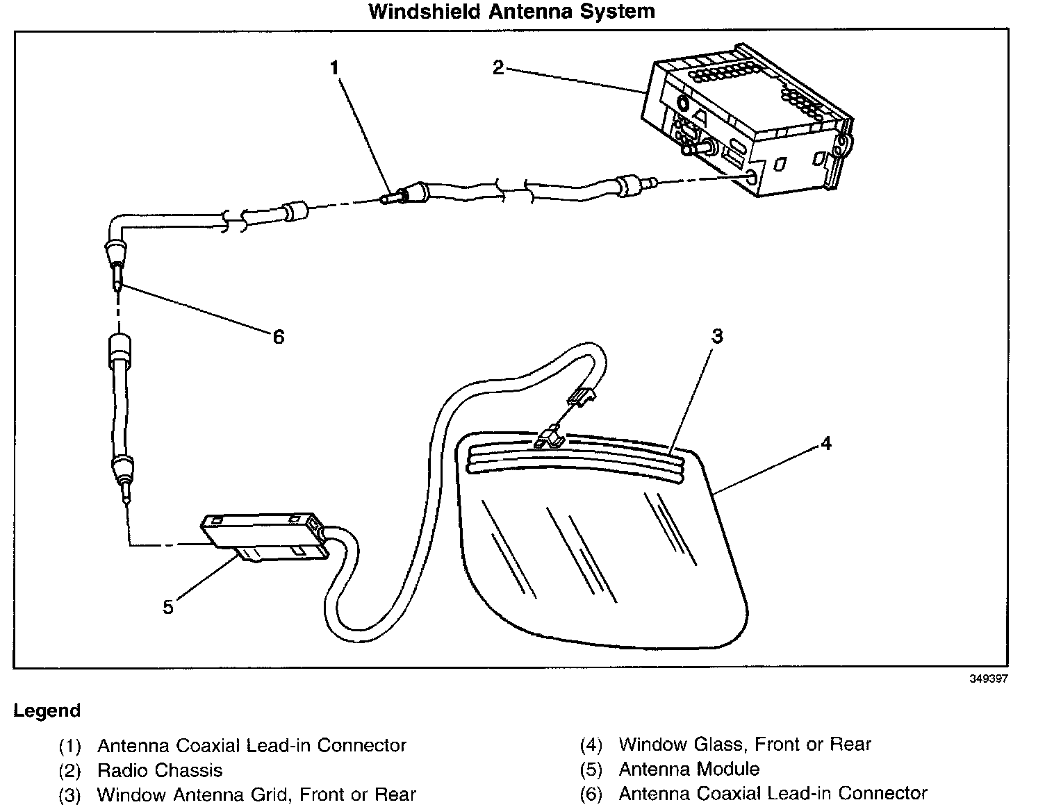 This antenna system uses two antennas to form a diversity system. The primary antenna is part of the rear window. The primary antenna receives both AM and FM signals. The secondary antenna is located on the passenger side of the windshield. The secondary antenna receives only FM signals. The radio antenna module processes the antenna reception signals and phase aligns them to create one strong signal.