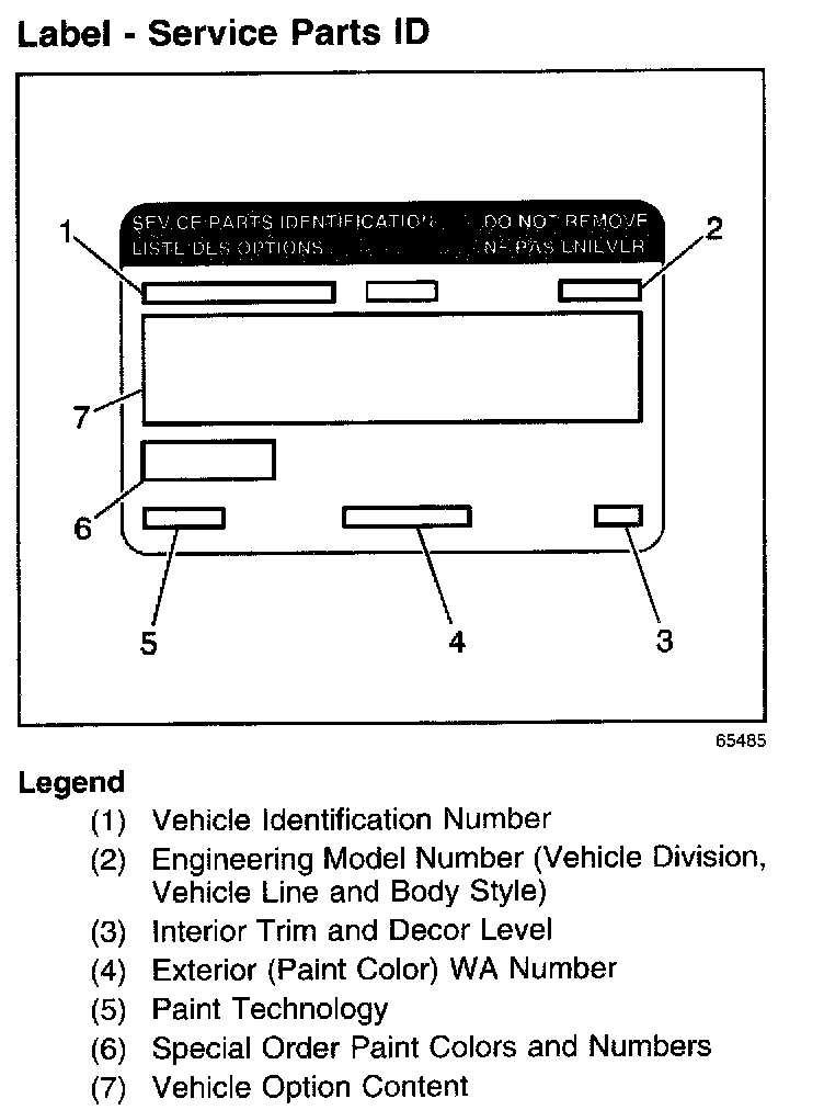 The service parts identification label (2) has been developed and placed on the inside of the rear compartment lid to help service and parts personnel identify parts and options that were originally installed on the vehicle. Refer to RPO Code List for a definition of the codes that are printed on the label or referred to in this service information.