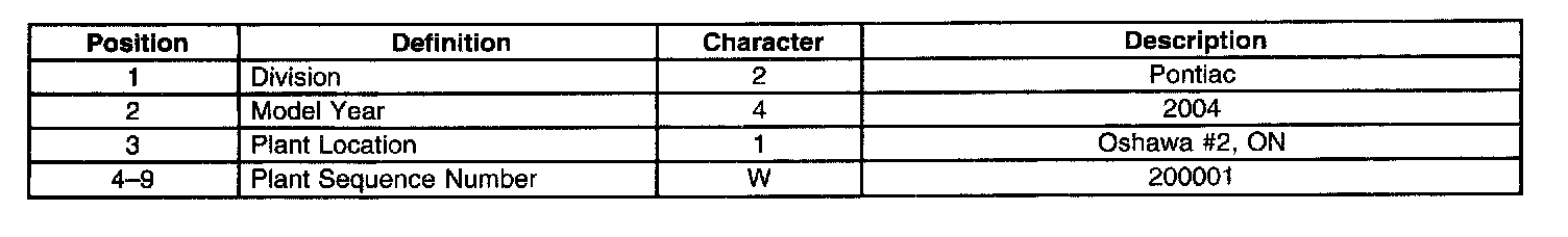 All engines and transaxles are stamped with a partial Vehicle Identification Number (VIN). The table identifies the different VIN derivative characters, character positions, and their respective descriptions.