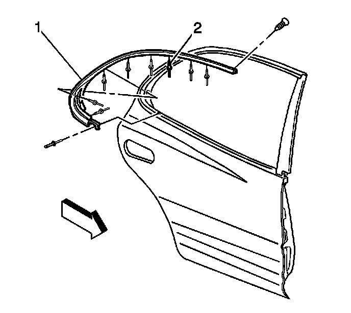 9. Remove the rear door outer belt sealing strip. Refer to Sealing Strip Replacement - Rear Door Window Belt Outer (Rear Door Window Belt Outer Sealing Strip Replacement) .