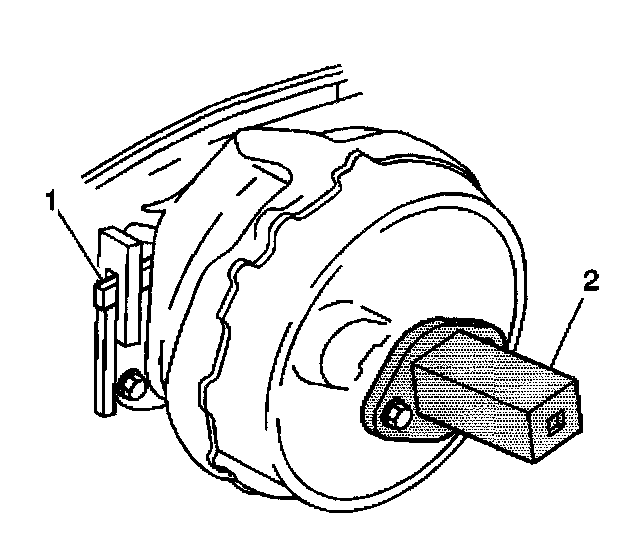 2. Turn the vacuum brake booster clockwise with a ratchet on the J 22805-B (2). DO NOT use a flat bladed tool in the locking tab to install the vacuum brake booster. When the vacuum brake booster is correctly installed, the locking tab (1) slides up the flange and engages the locking notch.