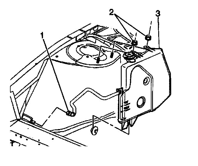1. Install the coolant recovery reservoir (3) to the lower retainer and the shock tower studs.