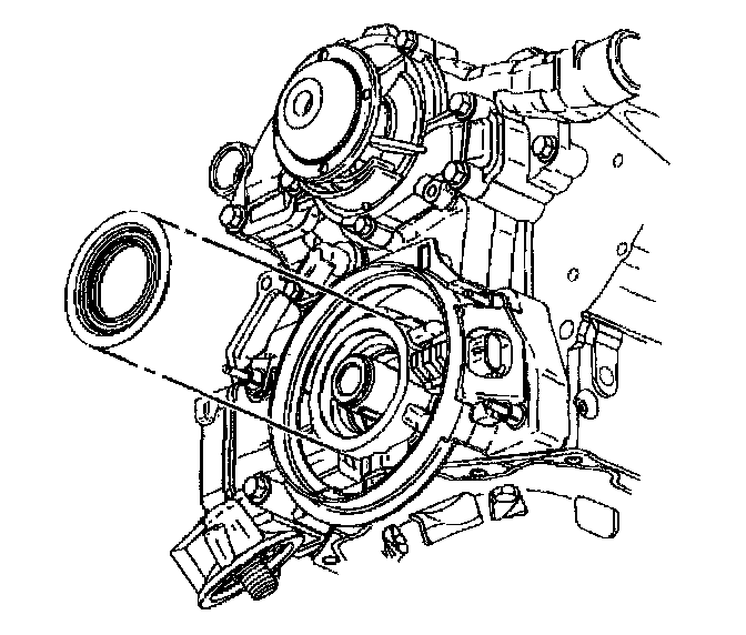 12. Pry out the crankshaft front oil seal with a flat-bladed tool such as a large screwdriver. Use care to avoid damaging the crankshaft front oil seal bore or the crankshaft front oil seal contact surfaces.