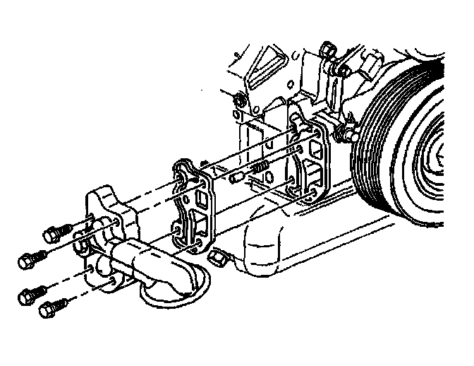 6. If replacing the engine front cover, install the pressure relief valve, the oil filter adapter and the oil filter adapter bolts to the engine front cover. Tighten