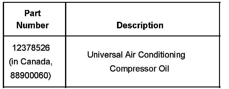 ^ Use only Polyalkylene Glycol Synthetic Refrigerant Oil (PAG) for internal circulation through the R-134a A/C system and only 525 viscosity mineral oil on fitting threads and 0-rings. If lubricants other than those specified are used, compressor failure and/or fitting seizure may result.
