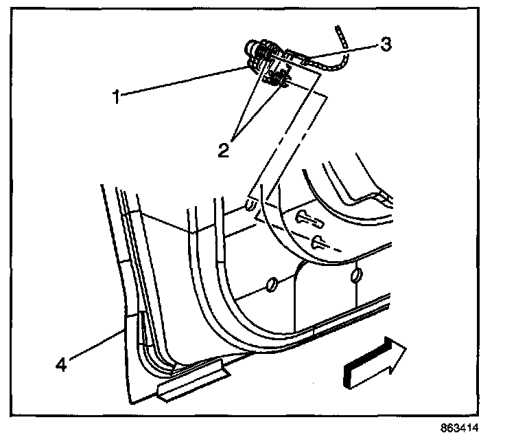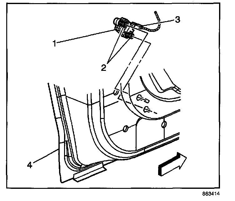10. Disconnect the left root rail module wiring harness yellow connector (2) from the left roof rail module (3).
