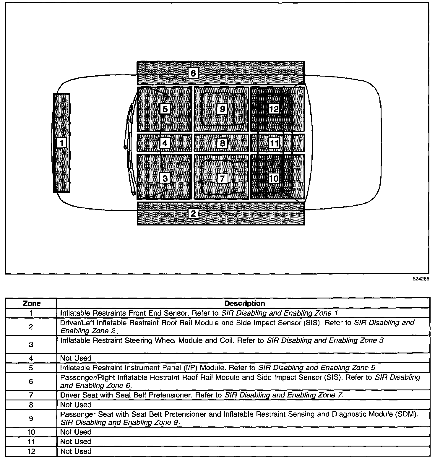 It may be necessary to disable more than one zone depending on the location of other SIR components and the area being serviced, refer to SIR Zone Identification Views. Refer to the illustration, to identify the specific zone or zones in which service will be performed. After identifying the zone or zones, proceed to the disabling and enabling procedures for that particular zone or zones.