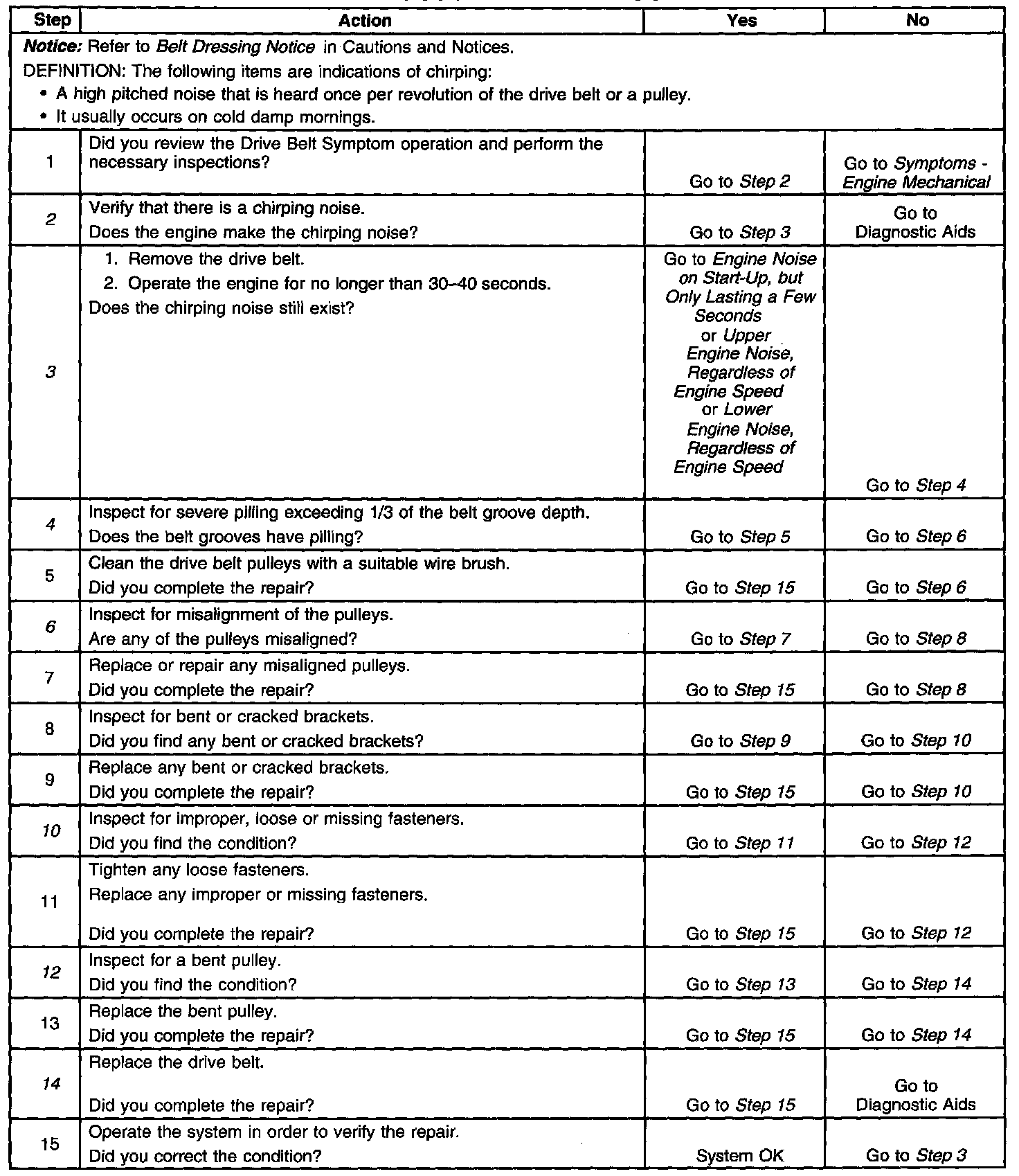 Diagnostic AidsThe symptom may be intermittent due to moisture on the drive belt or the pulleys. It may be necessary to spray a small amount of water on the drive belt in order to duplicate the customers concern. If spraying water on the drive belt duplicates the symptom, cleaning the belt pulleys may be the probable solution.