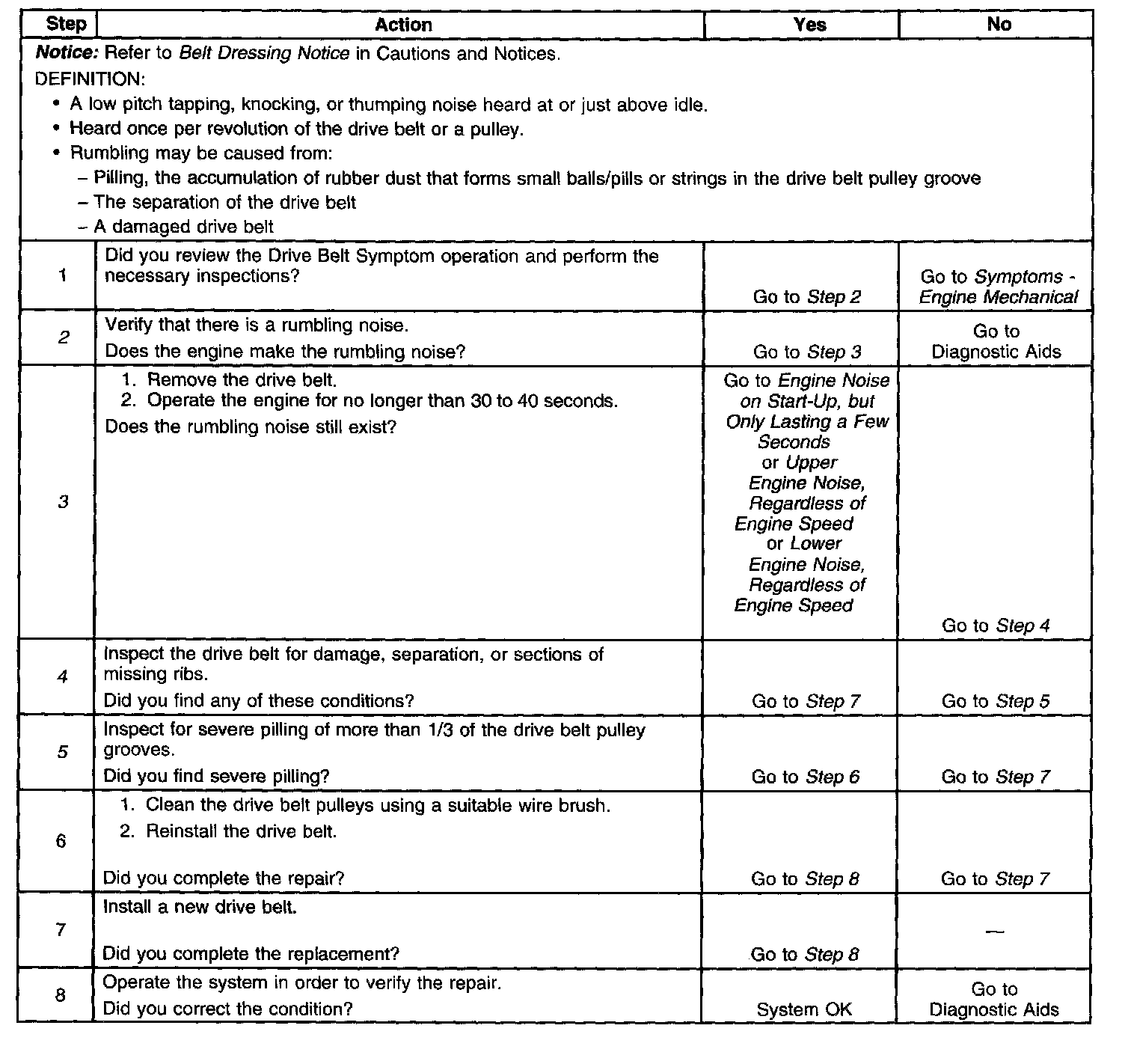 Diagnostic AidsVibration from the engine operating may cause a body component or another part of the vehicle to make rumbling noise. The drive belt may have a condition that can not be seen or felt. Sometimes replacing the drive belt may be the only repair for the symptom. If replacing the drive belt, complete the diagnostic table, and if the noise is only heard when the drive belt is installed, there might be an accessory drive component with a failure. Varying the load on the different accessory drive components may aid in identifying which component is causing the rumbling noise.