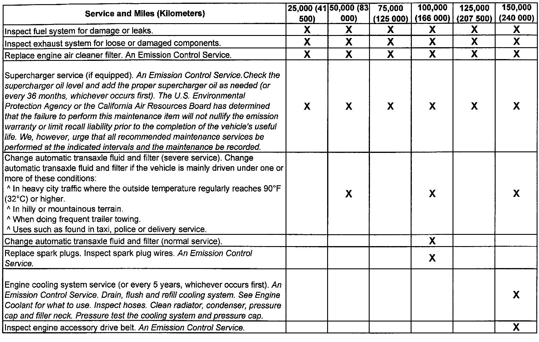 (Maintenance I or Maintenance II) after the indicated kilometers (miles) shown for each item.