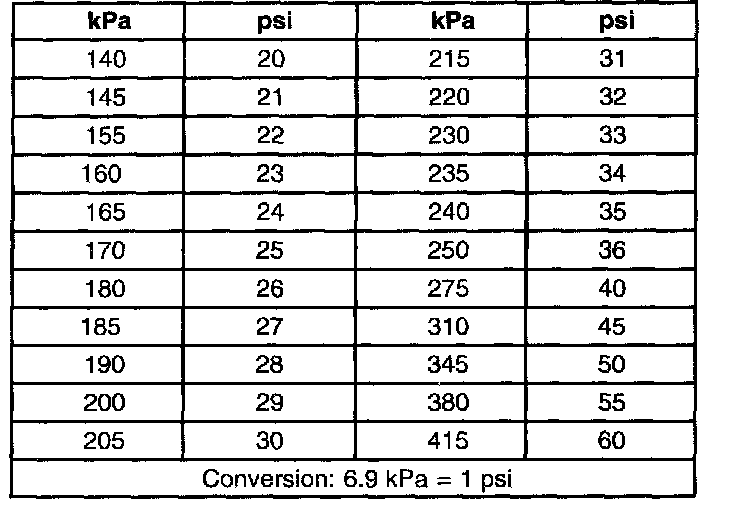 Inflation Pressure Conversion (Kilopascals to PSI)