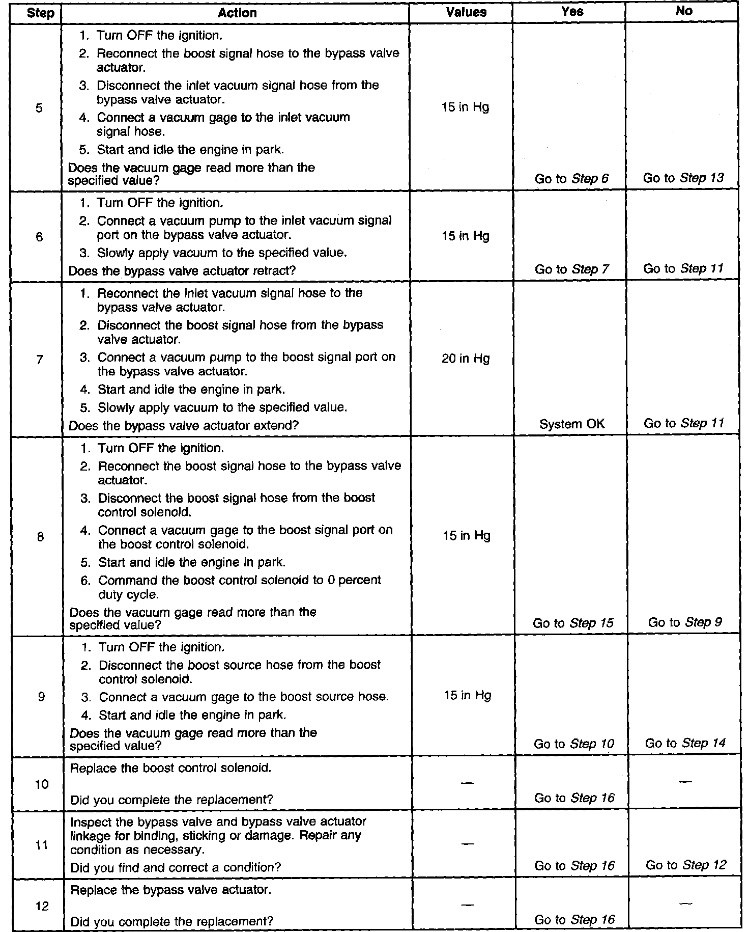 The PCM controls boost pressure by using the boost control solenoid The boost control solenoid is a normally open valve. Under most conditions, the PCM commands the boost control solenoid to operate at a 100% duty cycle. This keeps the solenoid valve closed and allows only inlet vacuum to control the position of the bypass valve. At idle, engine vacuum is applied to the upper side of the bypass valve actuator, counteracting spring tension to hold the bypass open. As engine load is increased, engine vacuum is decreased, causing the spring in the bypass valve actuator to overcome the applied vacuum, closing the bypass valve and allowing the boost pressure to increase. When reduced boost pressure is desired, the PCM commands the boost control solenoid to operate at a 0 percent duty cycle. This opens the solenoid valve and allows boost pressure to enter the bypass valve actuator at the lower side to counteract the spring tension, opening the bypass valve and recirculating excess boost pressure back into the supercharger inlet.