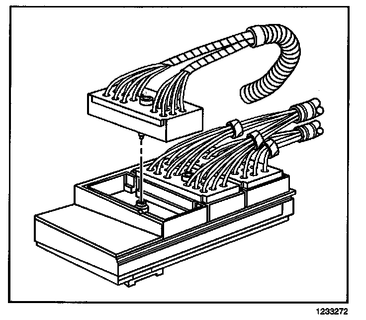 5. Loosen the bolts (1) retaining the engine, IP and forward lamp wiring harness connectors to the junction block.
