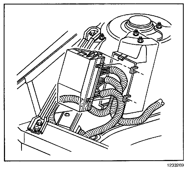 1.1. Position the BEC housing (1) to the strut tower and insert the lower tab into the slot on the tower.