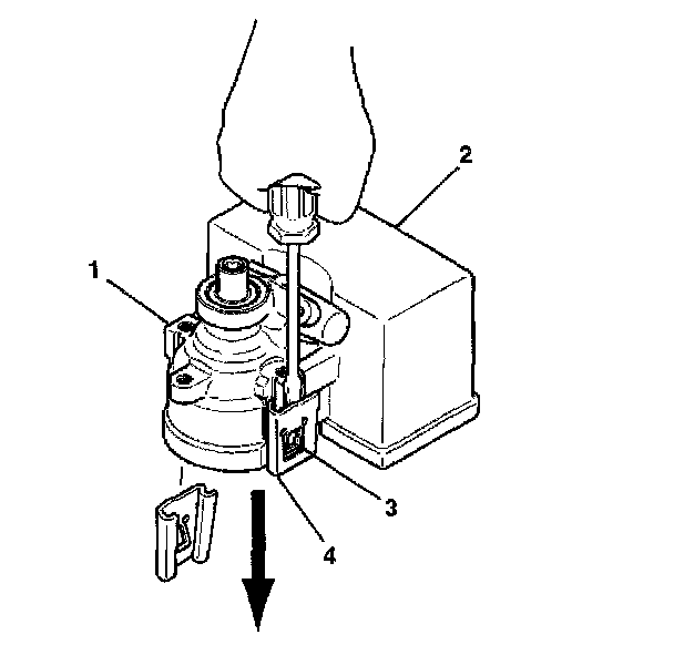 3. Using the screwdriver, force the retaining clip tab (3) outward.