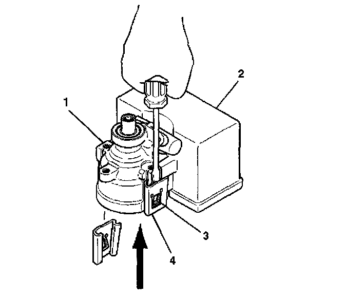 4. Slide the reservoir clip (4) away from the hydraulic pump assembly (1).