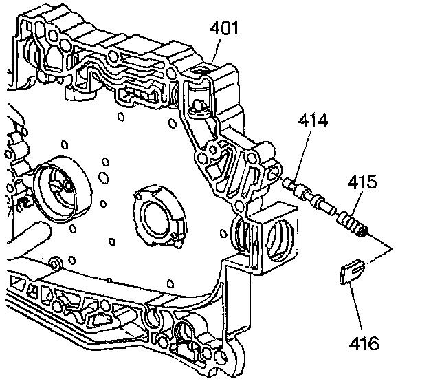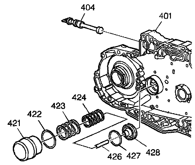 6. Insert the 3-4 accumulator piston pin (426) through the front of the case cover (401) and into the 3-4 accumulator piston (428).