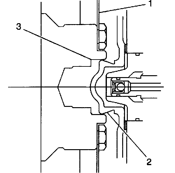 3. Align the torque converter hub (2) in the engine crankshaft (3) and install the torque converter to flywheel bolts.