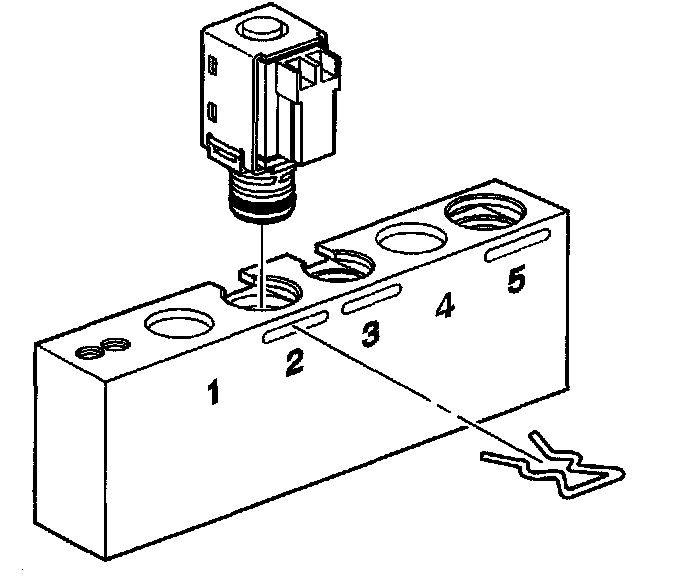 2. Install the 1-2, 3-4 or the 2-3 shift solenoid valve into bore number 2 of the J44246 and install the factory retainer clip to retain the solenoid.