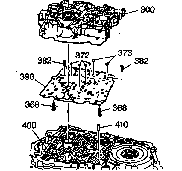 4. Remove the valve body (300) while keeping the spacer plate and gasket assembly (396) with the transaxle.