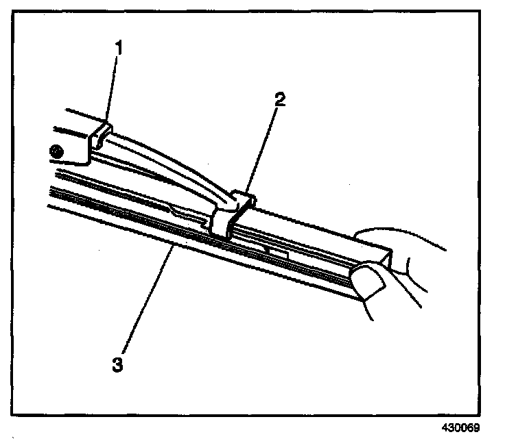 1. Insert the open end of the wiper blade element (3) into the bottom claws of the wiper blade (2).