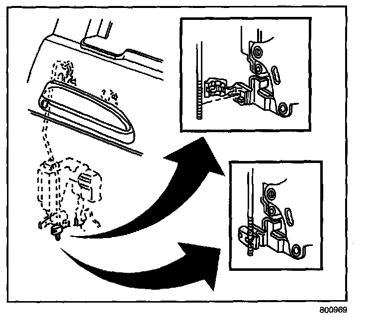 - When servicing a vehicle with adjustable outside handle lock rods, remove all free play between the outside handle and the lock. Also, do not operate the outside handle before these connections are made.