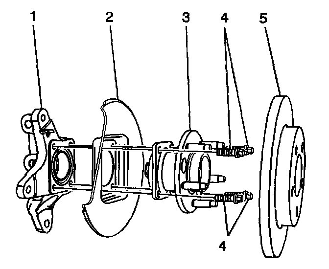 Important: The backing plate (2) is attached to the knuckle (1) through the wheel bearing hub bolts (4).