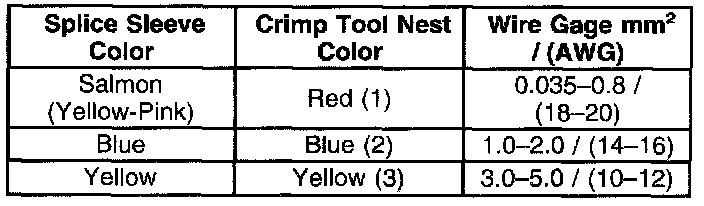 4. Select the proper sealed splice sleeve according to the wire size. Refer to the above table at the beginning of the repair procedure for the color coding of the splice sleeves and the crimp tool nests.