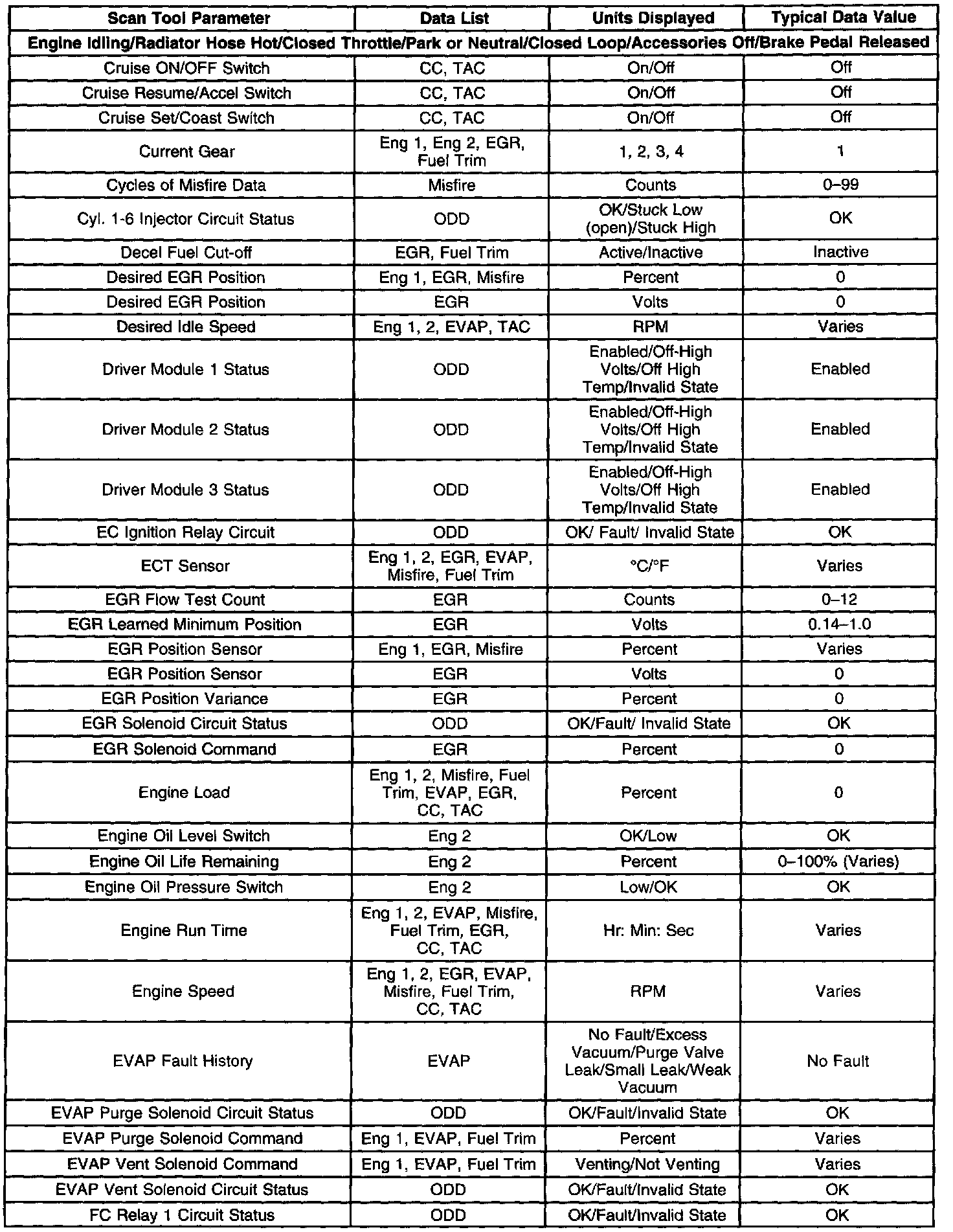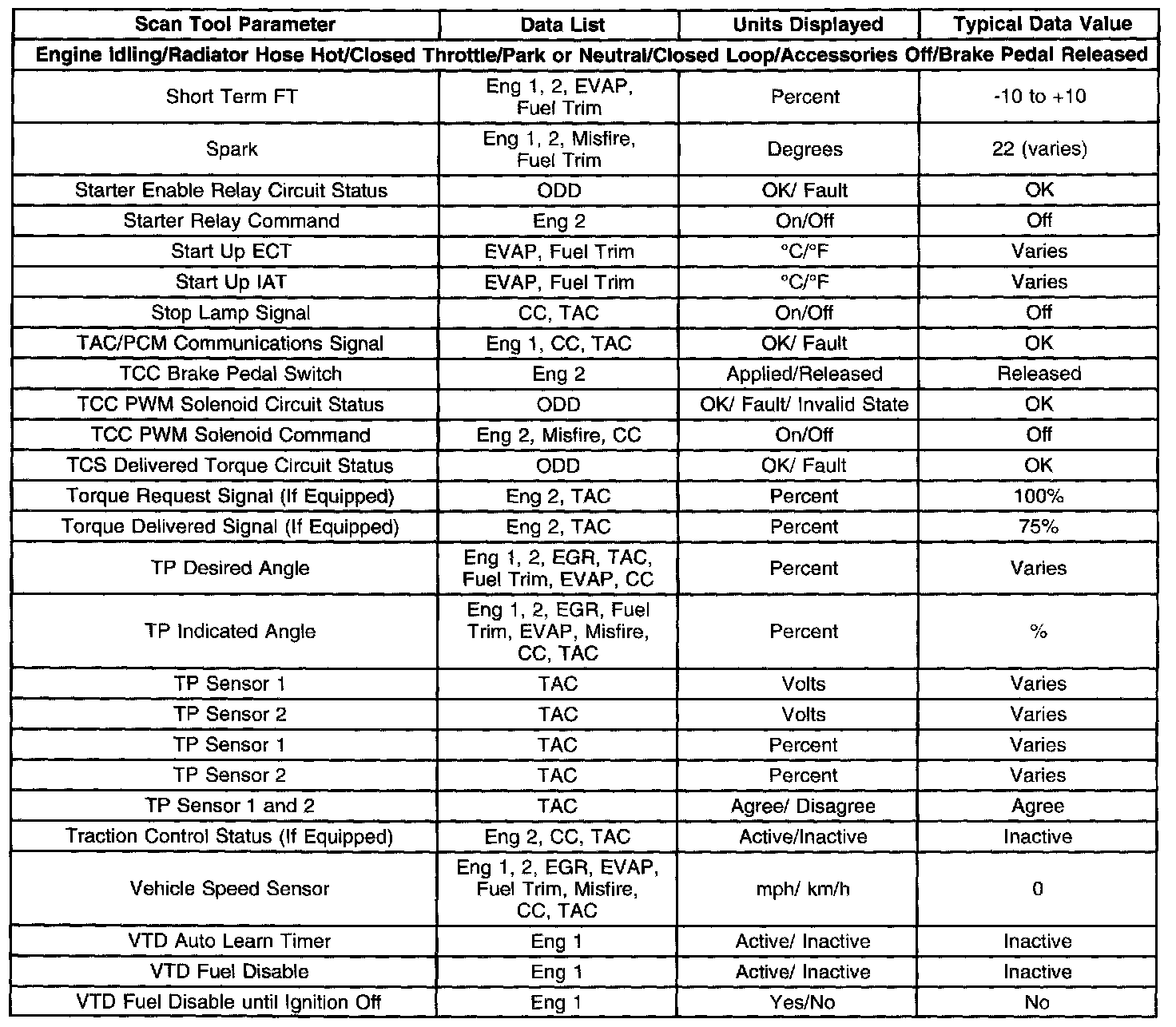 The Engine Scan Tool Data List contains all engine-related parameters that are available on the scan tool. The list is arranged in alphabetical order. A given parameter may appear in any one of the data lists, and in some cases may appear more than once, or in more than one data list in order to group certain related parameters together.