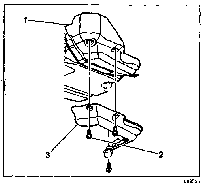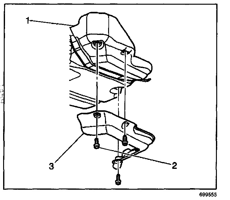 . Position the fuel tank shield (3) to the fuel tank (1).