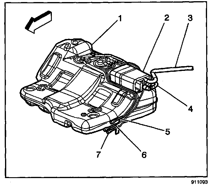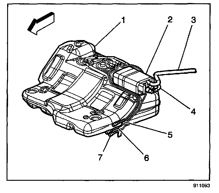 3. Install and connect the fuel feed (6), the fuel return (7), and the EVAP pipe (5) assemblies and the insulator clips to the fuel tank (1) as noted during removal.