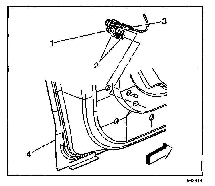6. Remove the inflatable restraint side impact sensor (1) out from the door (4).