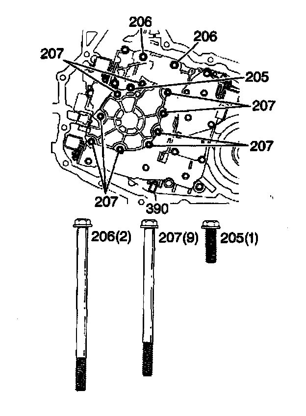 3. Remove the oil pump bolts (206,207).