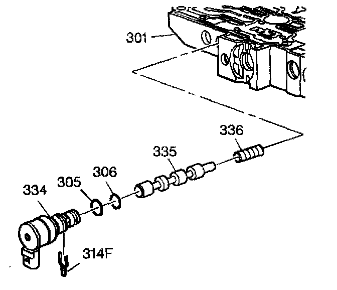 5. Disconnect the Torque Converter Clutch Pulse Width Modulation (TCC PWM) solenoid electrical connector. 6. Remove the TCC PWM solenoid retaining clip (314F).