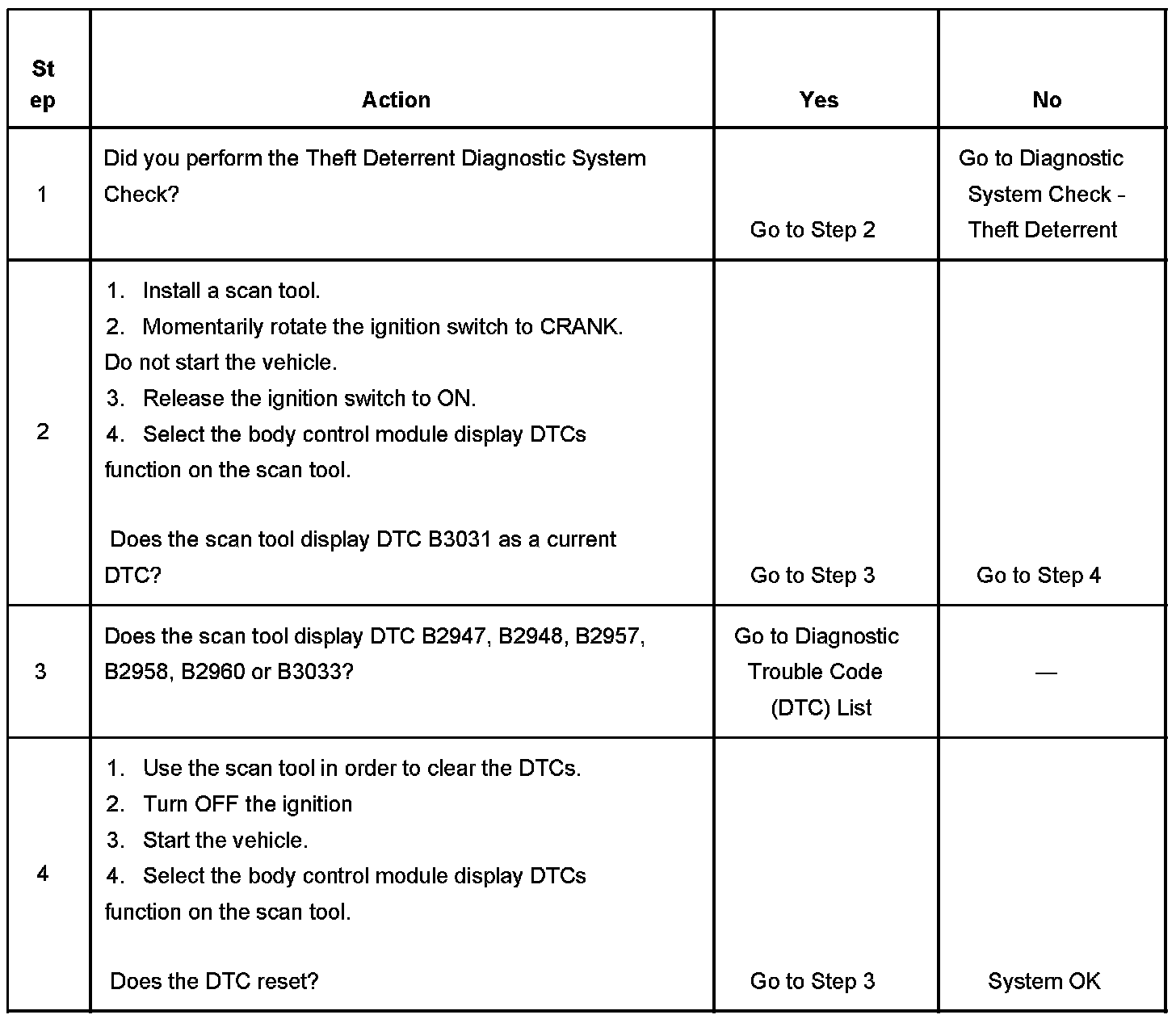 - If DTC B3031 is set in the BCM as a history DTC, clear the DTC and recheck the system. A history DTC B3031 indicates that the BCM has successfully completed the programming mode.