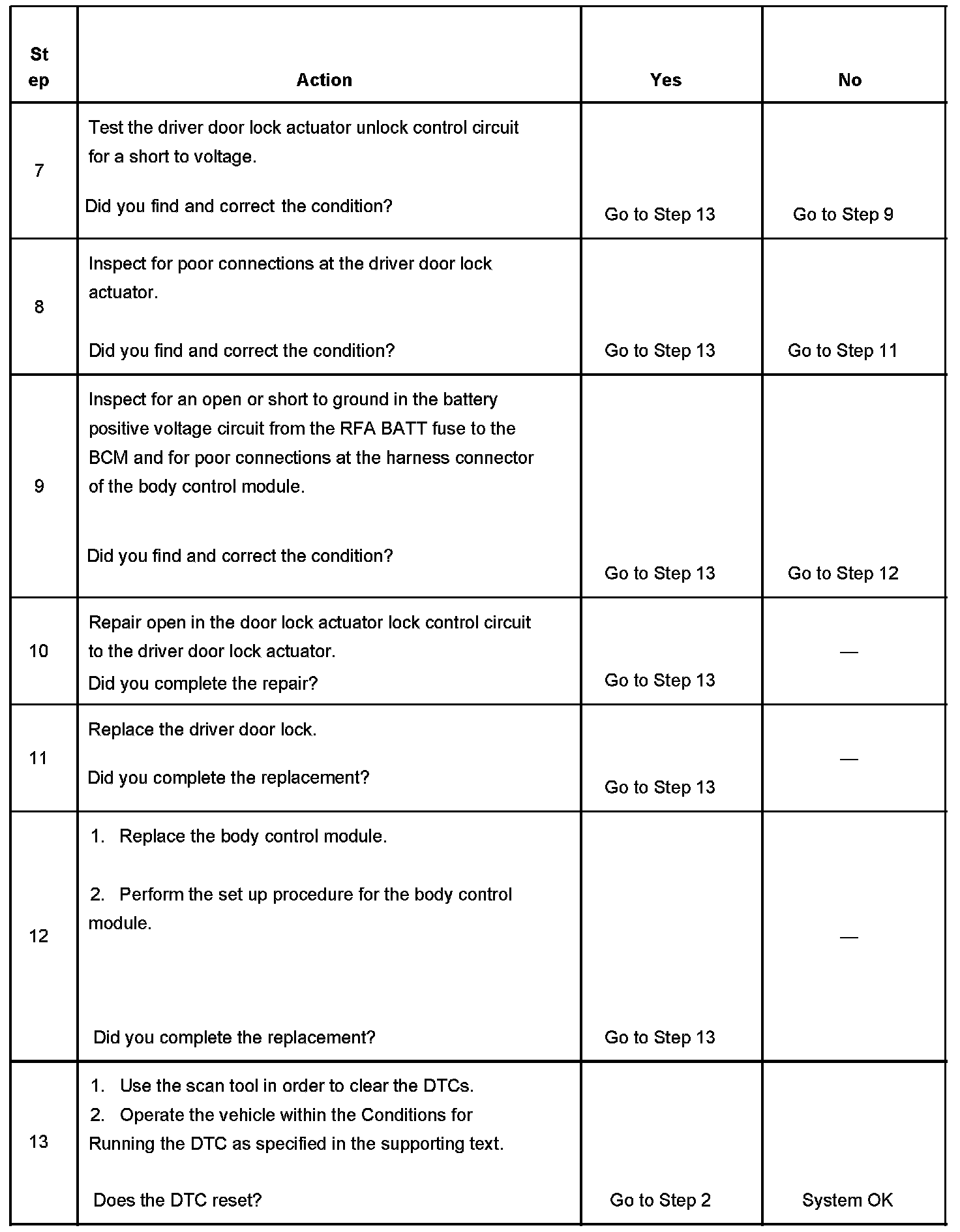 - The BCM detects a short to ground in the driver door lock actuator unlock control circuit or the RFA BATT fuse is open while commanding the driver door lock actuator to unlock the door lock.