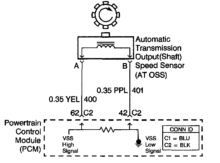The Automatic Transmission Output Shaft Speed Sensor (AT OSS) provides vehicle speed information to the PCM. The AT OSS is a permanent magnet generator mounted to the transmission case. The AT OSS produces an AC voltage as the transmission speed sensor rotor teeth pass through the magnetic field of the sensor. The AC voltage level increases as the speed of the vehicle increases. The PCM converts the AC voltage into a digital signal. The PCM uses the vehicle speed signal to determine shin timing, Torque Converter Clutch (TCC) apply, TCC release, and gear ratio calculations.