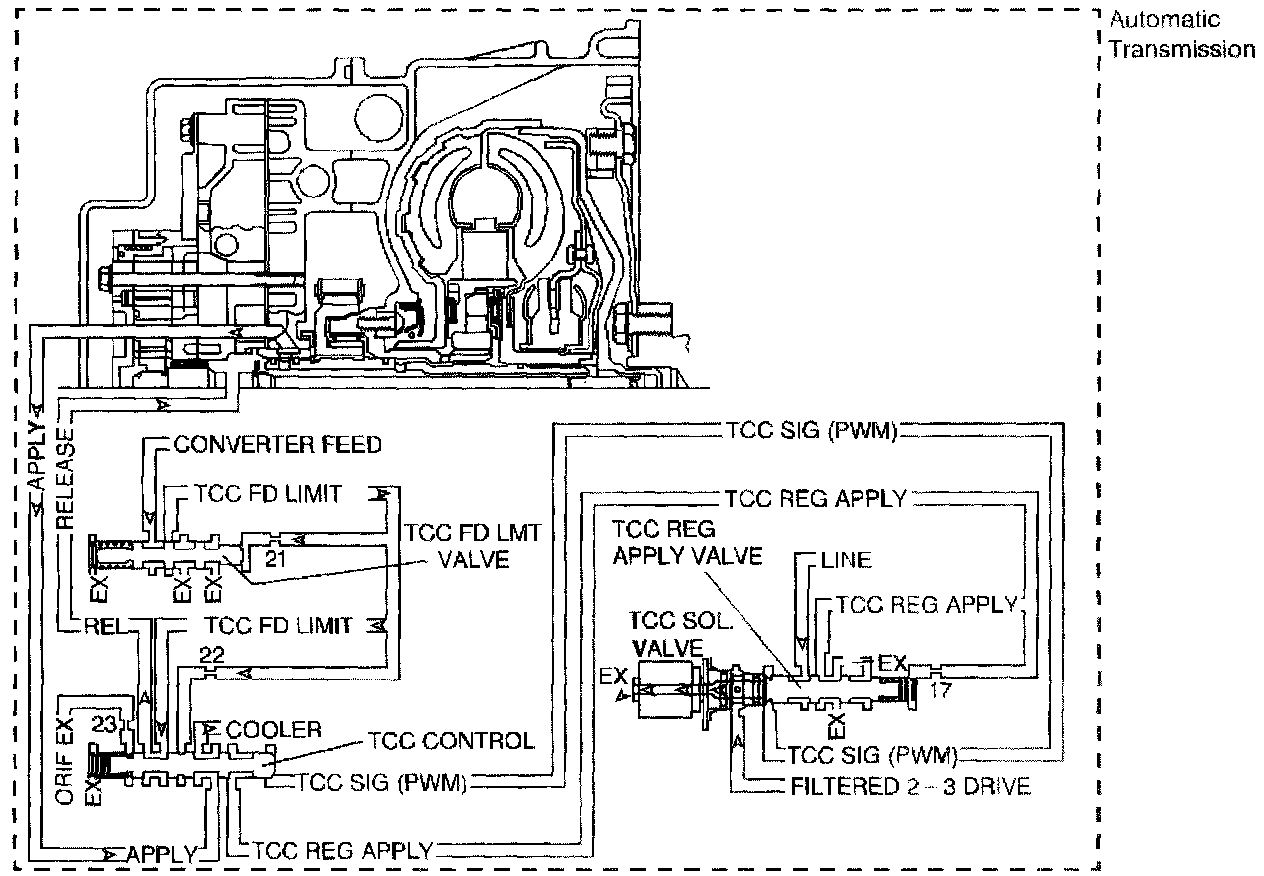 When the TCC PWM solenoid valve is de-energized, the solenoid blocks filtered 2-3 drive fluid, and allows TCC signal fluid to exhaust. When energized, the solenoid modulates fluid into the TCC signal fluid circuit. When fully energized, modulation stops. and the solenoid blocks both 2-3 drive fluid and TCC signal fluid exhaust.