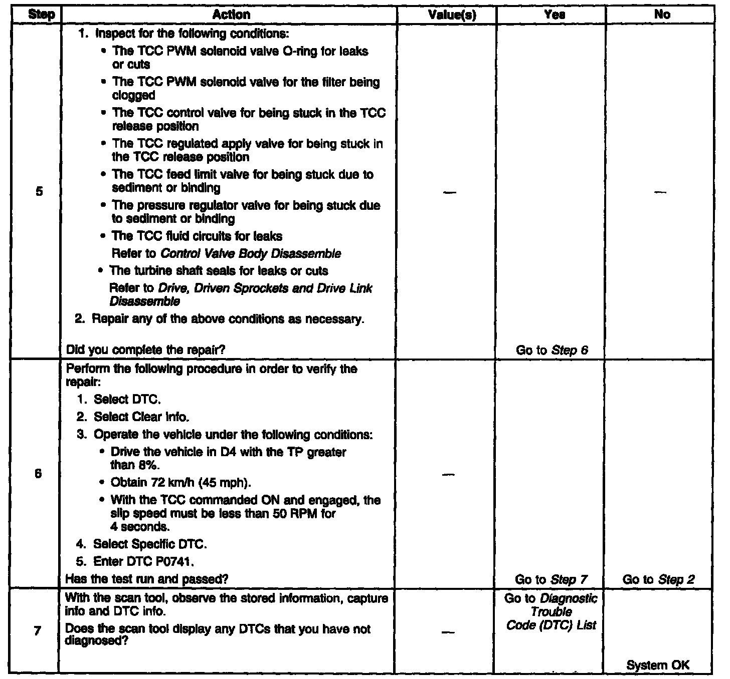 When the PCM detects a high TCC slip speed when the TCC is commanded ON, then DTC P0741 sets. DTC P0741 is a type B DTC.