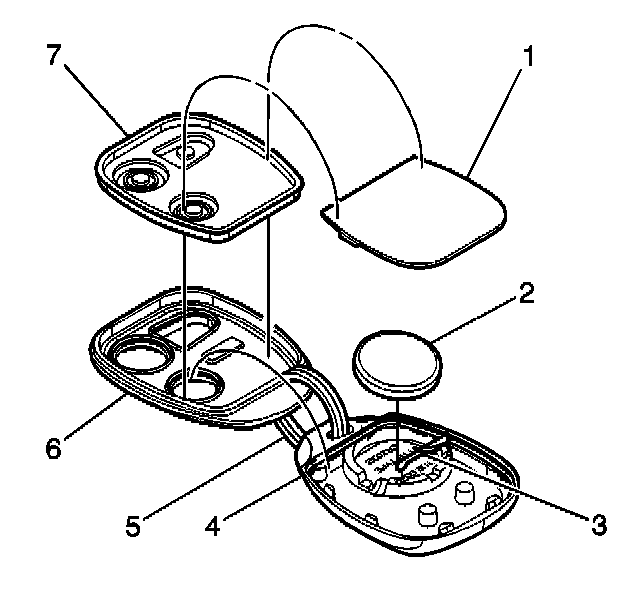 1. Insert a small flat-bladed tool between the 2 halves of the transmitter case (6,4) at the slot provided near the key ring (5) hole.