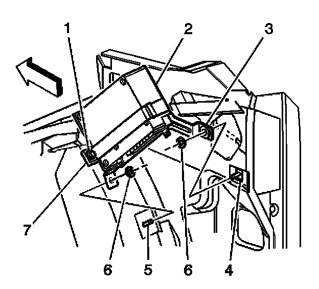 9. Pull downward on the back of the I/P compartment to remove the OnStar(R) module (2) from the bracket (3).
