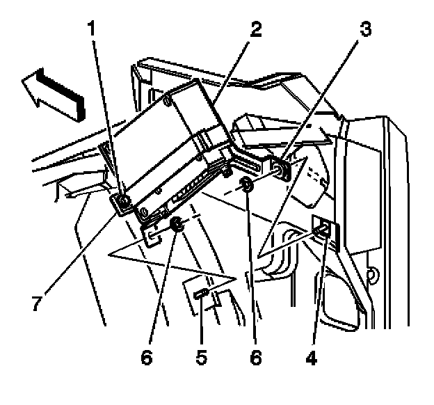 1. Install the OnStar(R) module (2) thorough the opening for the passenger inflator module.