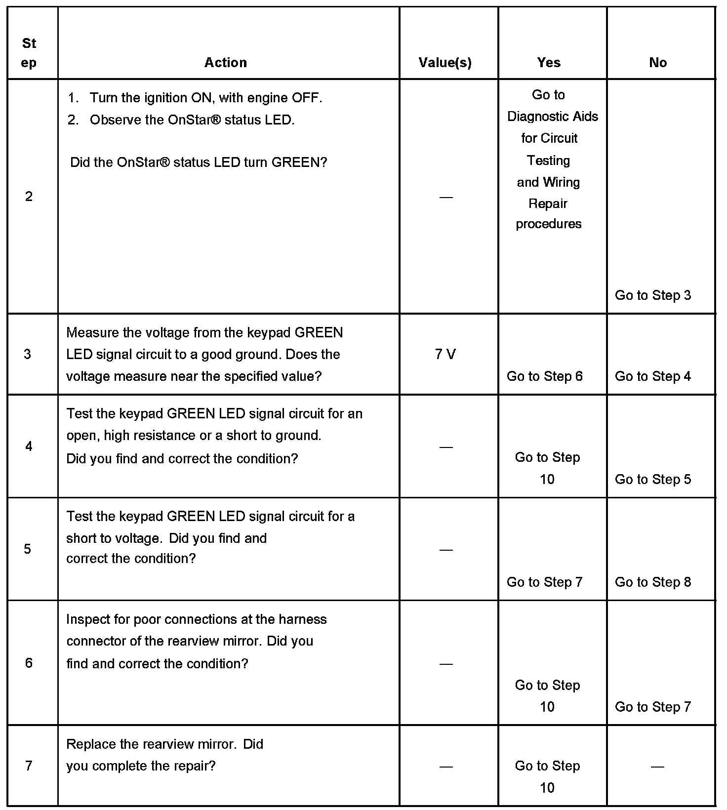 5. If the GREEN LED signal is shorted to voltage then the OnStar(R) 3-button assembly has been damaged and the OnStar(R) 3-button assembly must be replaced.