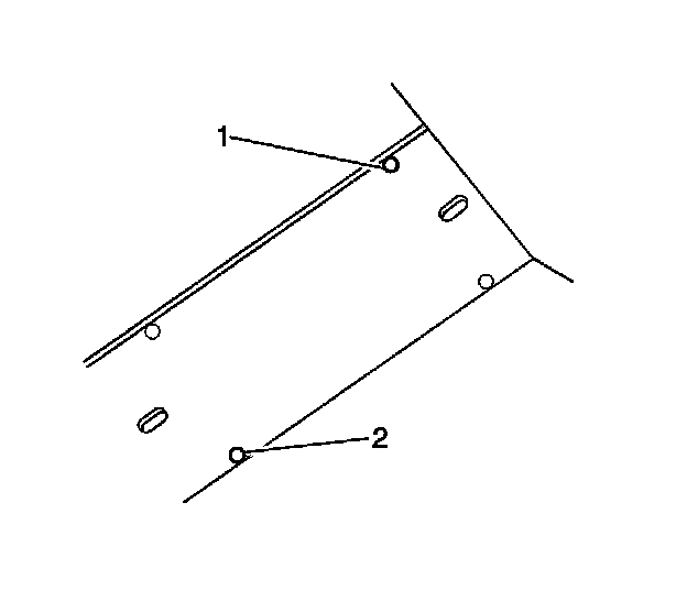 3. Remove the upper right stud (1) from the rear seat back brace and re-install in the middle lower slot (2) on the brace. Tighten the fastener to 4 Nm (36 lb in).