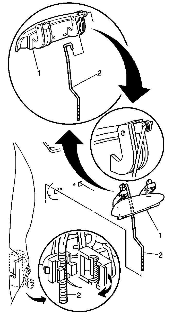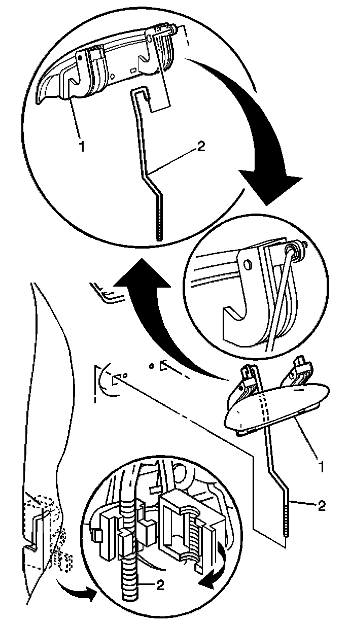 5. Use a small flat-bladed screwdriver in order to remove the outside handle rod (2) from the door lock assembly.