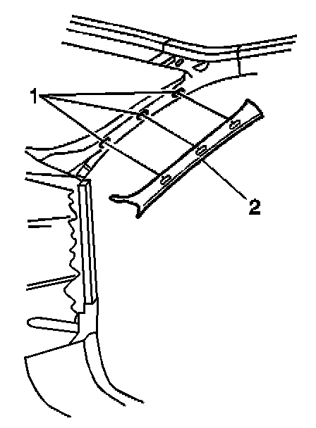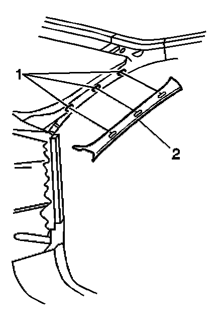 2. Pull the garnish molding (2) firmly and evenly in order to disengage the retainers from the windshield pillar.