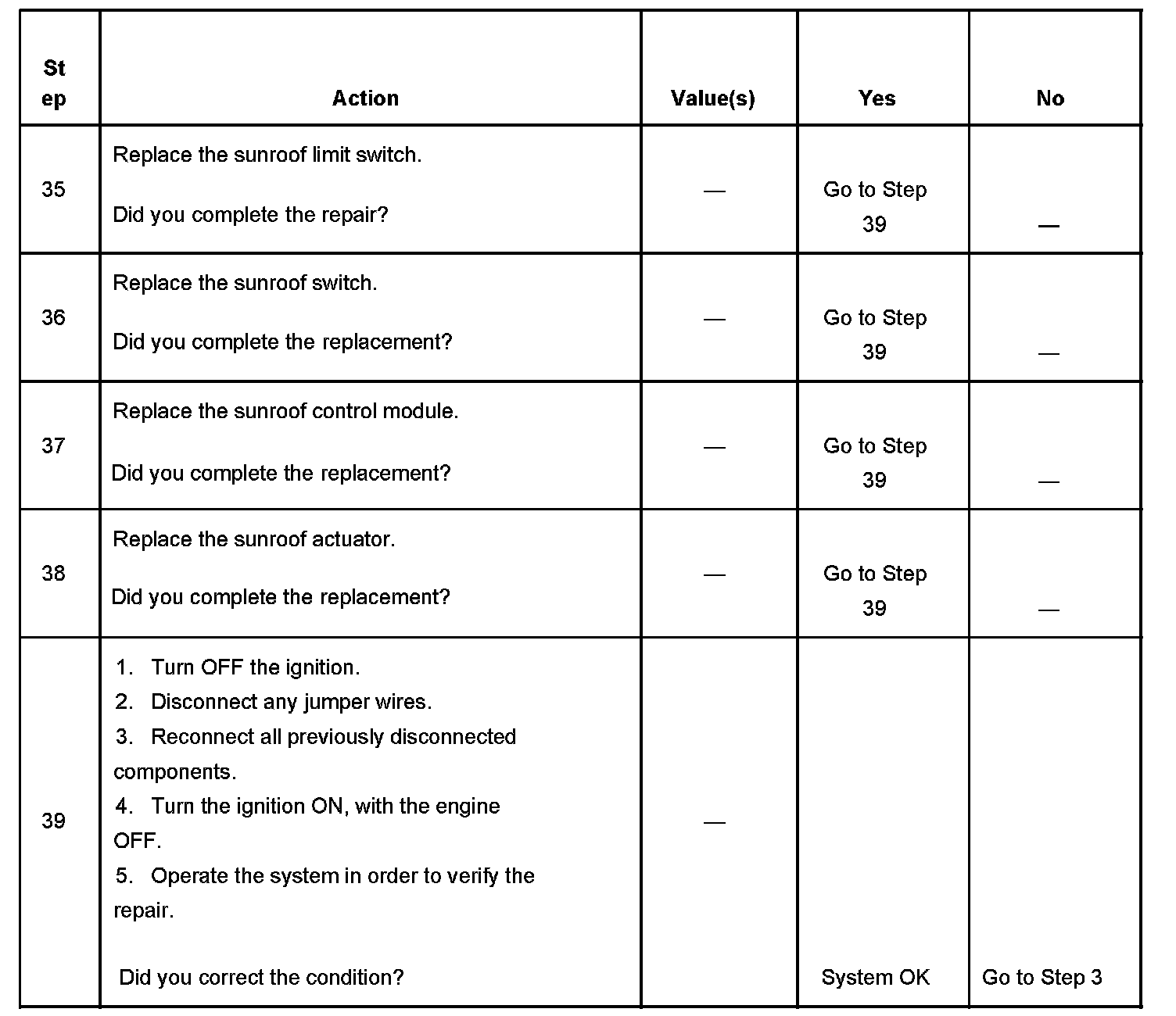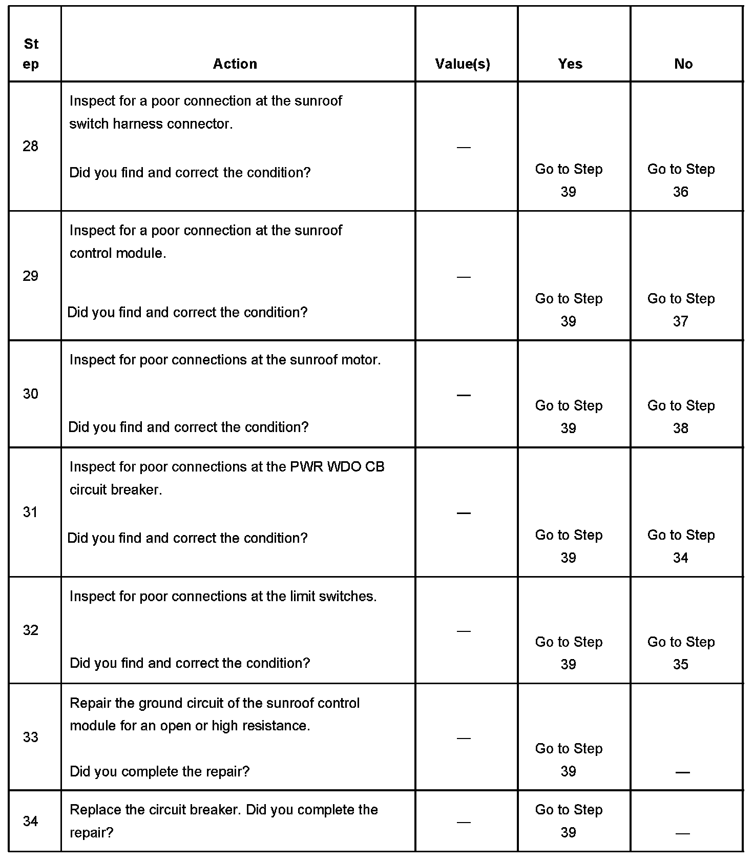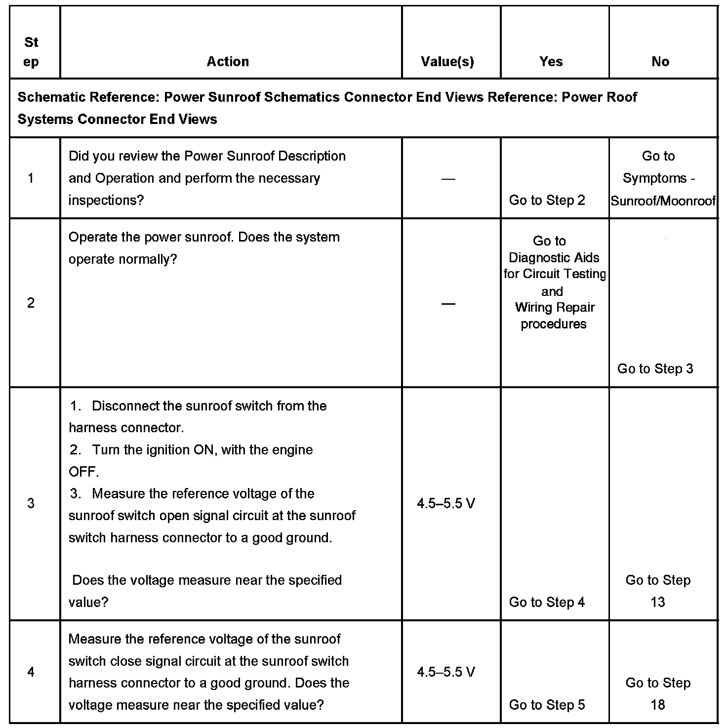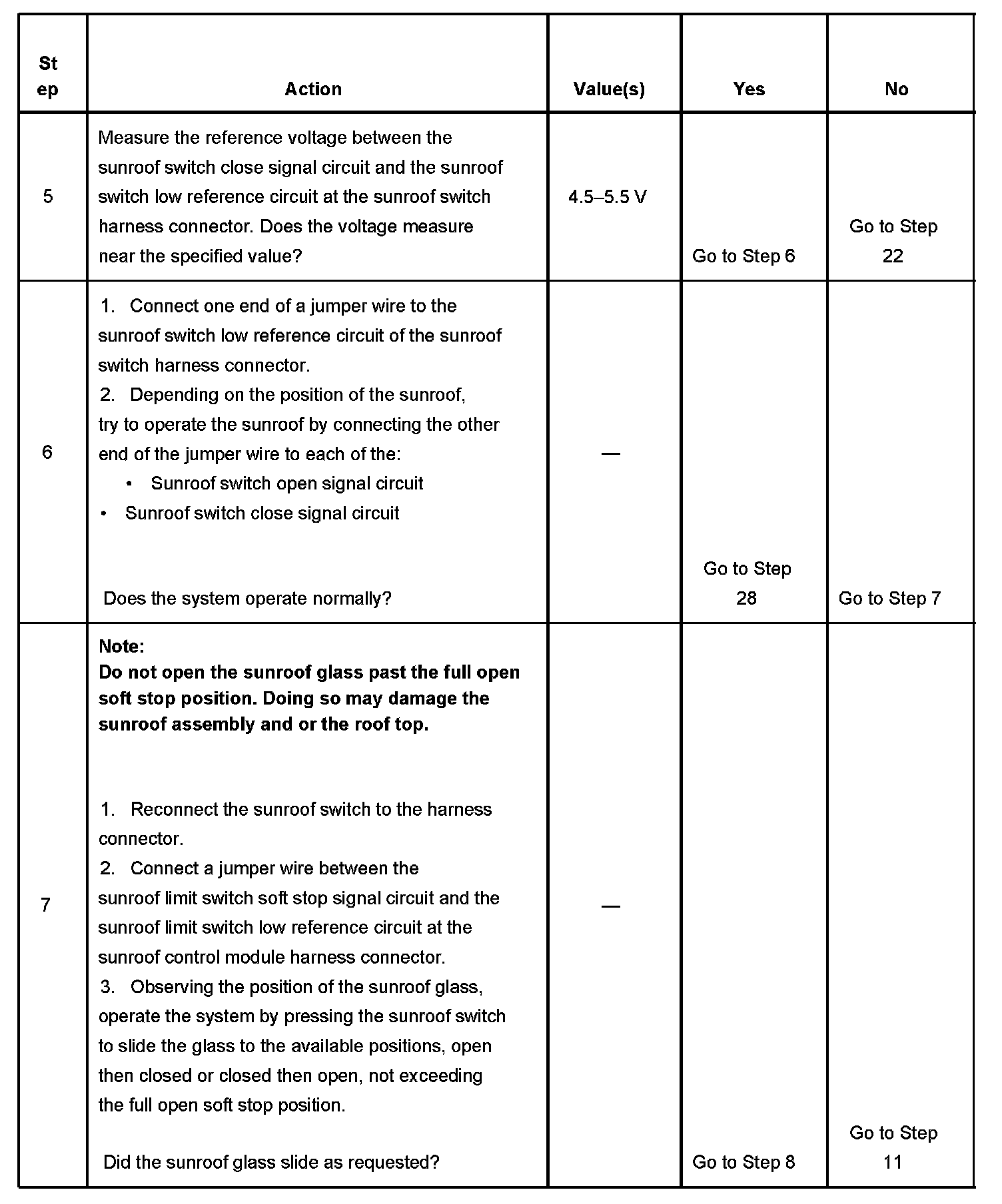 7. Using a jumper wire to jump between the sunroof limit switch soft stop signal circuit and the sunroof limit switch low reference circuit, will simulate that the sunroof glass is in a position other than close or full open position. This will allow any request from the sunroof switch to supply an output to drive the sunroof motor for testing the status of the limit switches.