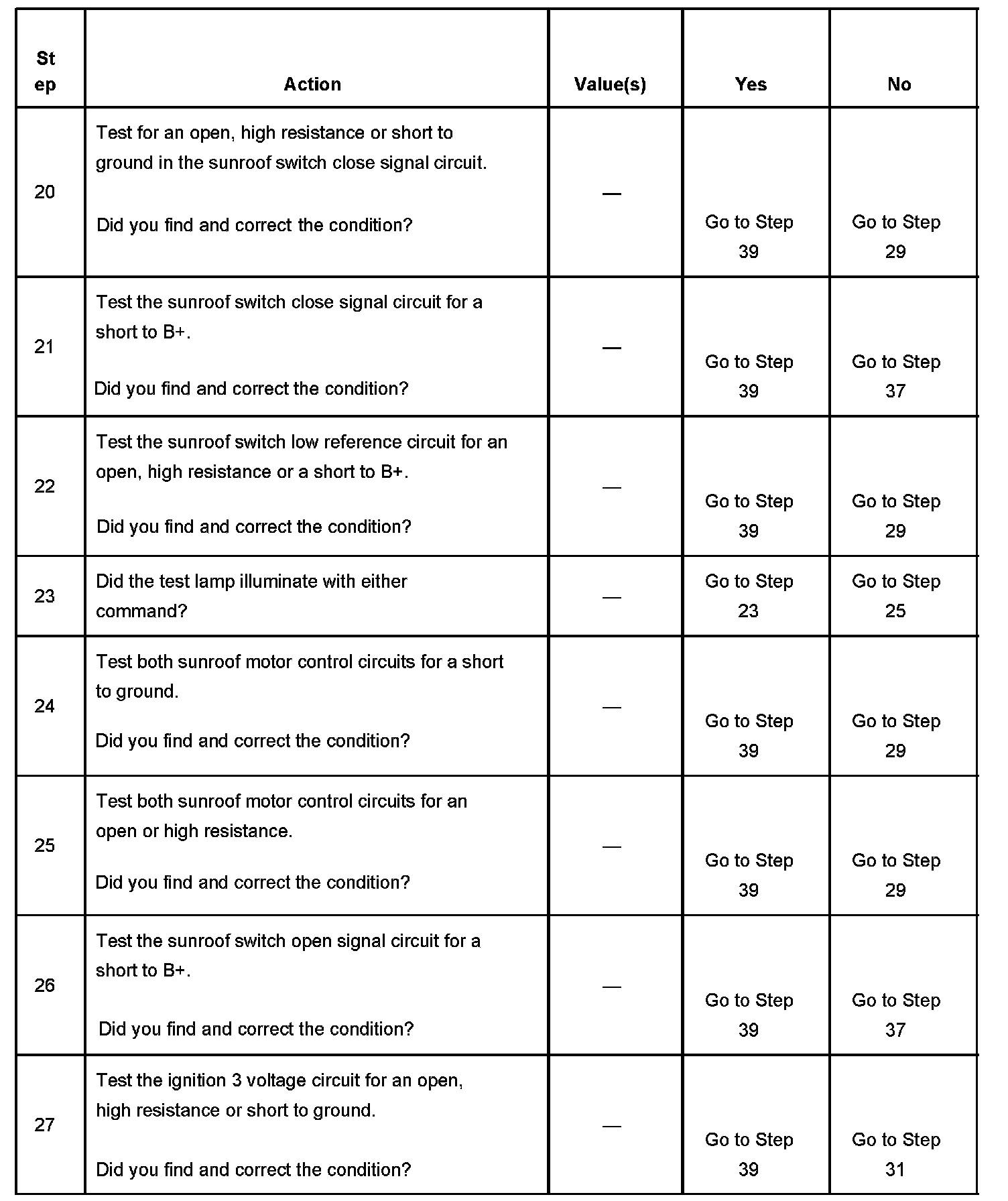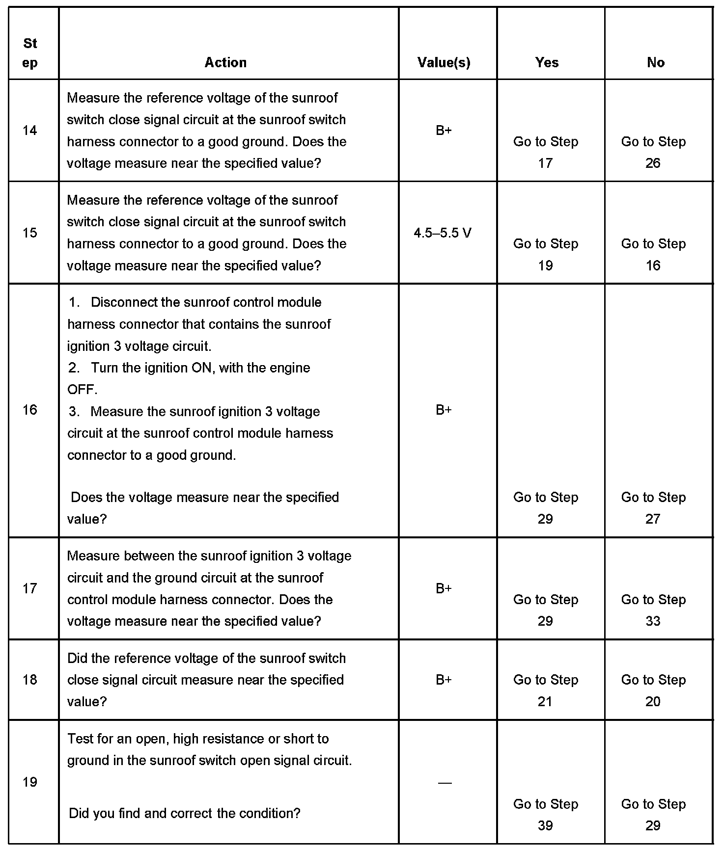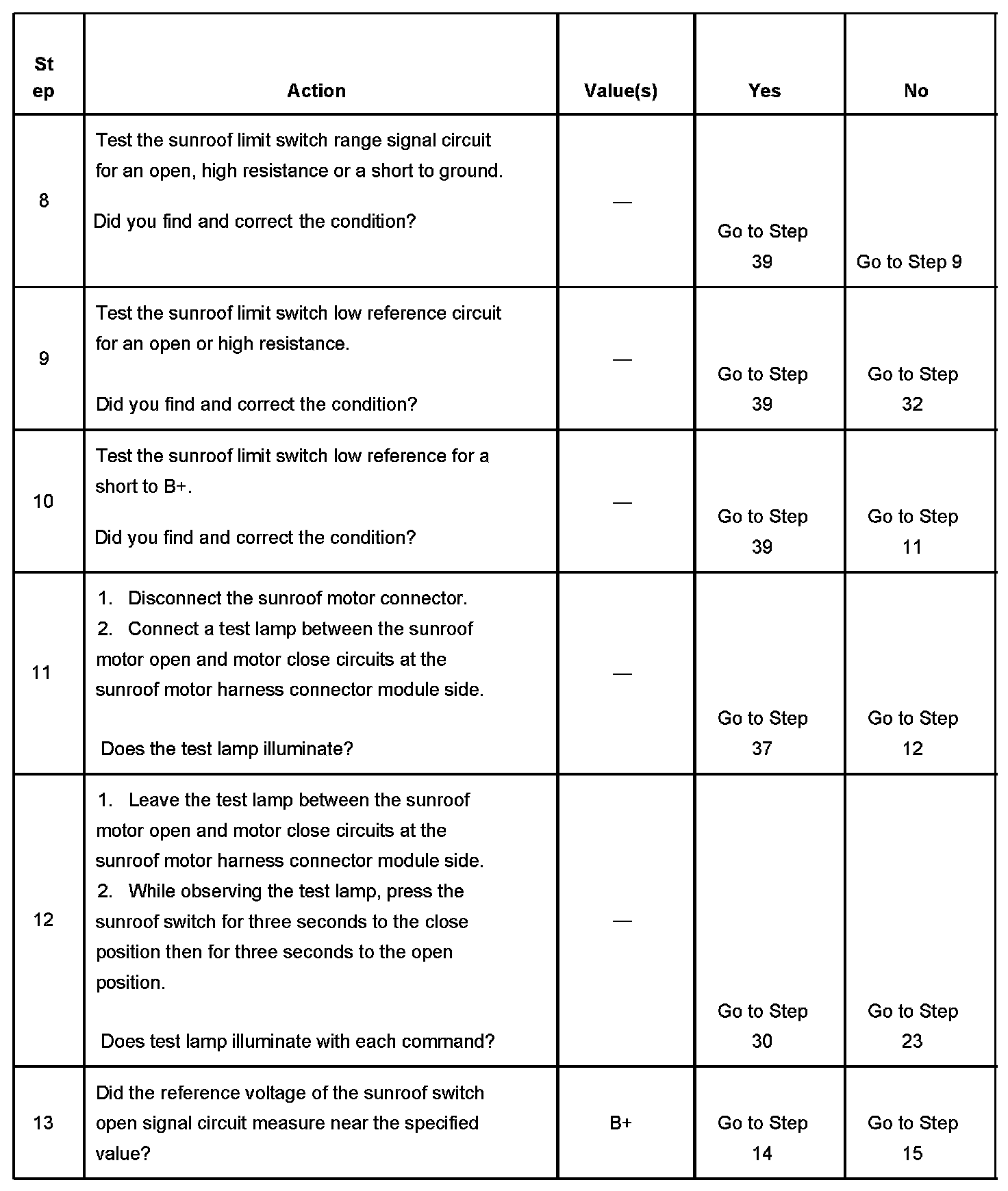 11. Checking the sunroof motor open and close output circuits, both should be at ground potential when idle.
