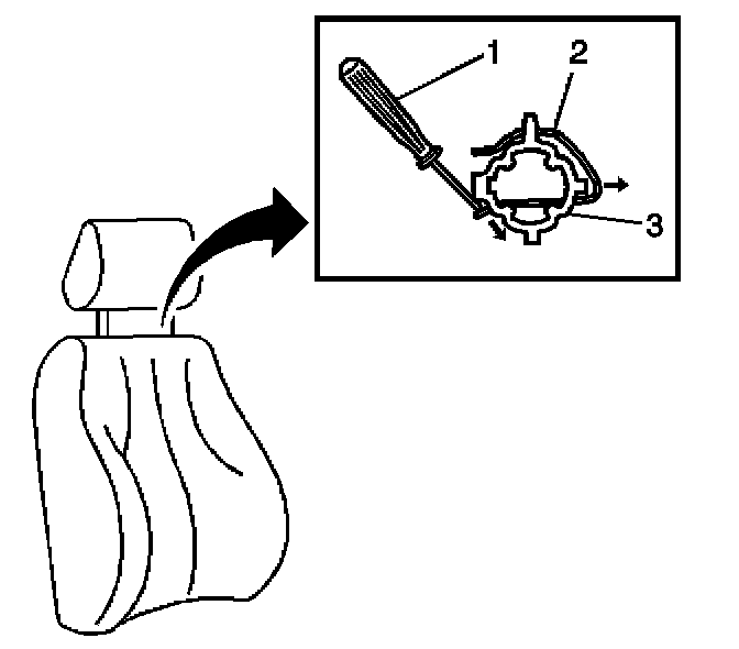3.2. Position the tip of the J 42214 (1) down along the right rear side of the head restraint guide tube (3) and the release retaining clip (2).